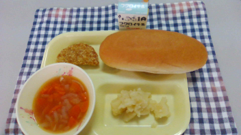 明日の給食は「ボロニアカツ・じゃがいものバター煮・ミネストローネ」です。