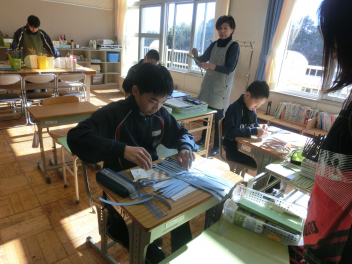 10組の家庭科では地域のボランティアの方や支援員の方の力を借りながら袋を製作しています