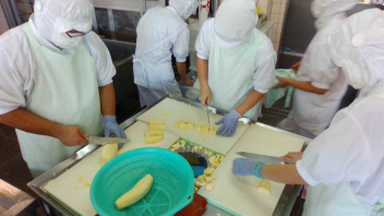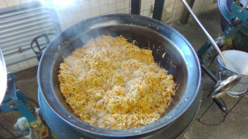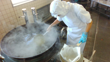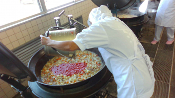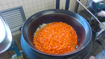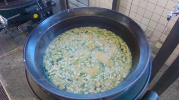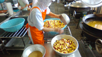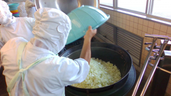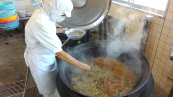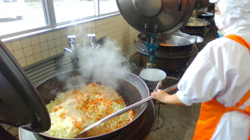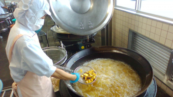 さつま汁は鹿児島県の郷土料理で、鶏肉を使った具だくさんのみそ汁です。今日のさつま汁には、鶏肉・さつま揚げ・ごぼう・にんじん・さつまいも・小松菜が入りました。