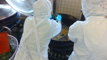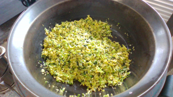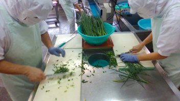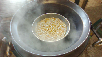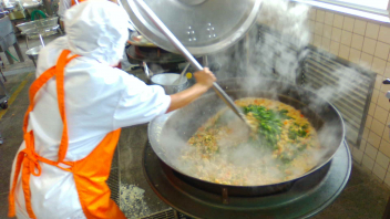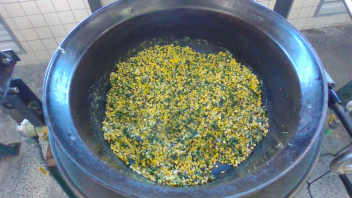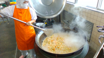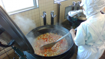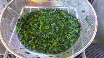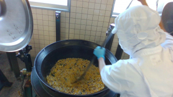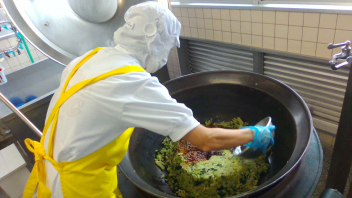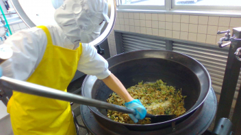ほうれん草ソテーは、ベーコン・しめじ・コーン・ほうれん草が入りました。均一に食材が加熱されるように、火が通りにくい食材は茹でてから炒める工夫をしています。