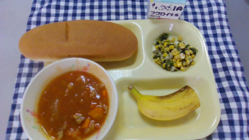 ・パン ・牛乳 ・ポークシチュー ・ほうれん草ソテー ・バナナ