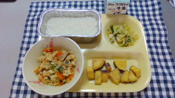 ・ごはん ・牛乳 ・炒り豆腐 ・さつまいもの香味揚げ ・おひたし