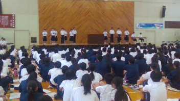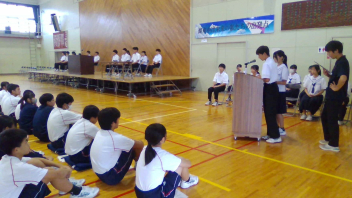 生徒総会では、生徒会本部や各委員会から年間の活動報告が行われ、今年度の取り組みを全校で振り返ることができました。落ち着いた雰囲気の中で発表が進み、生徒一人ひとりが学校の一員として活動を支えていることを改めて感じられる時間となりました。また会の中では、3年生から2年生の新生徒会へと活動のバトンが引き継がれました。これまで学校を支えてきた3年生の姿に感謝の気持ちを抱くとともに、新たに中心となる2年生の活躍に期待が高まりました。