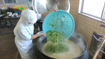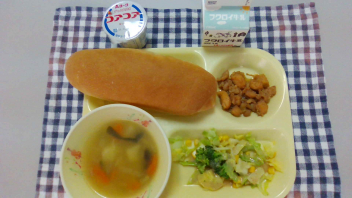 明日の給食は「ウインナーソーセージ・さつまいものバター煮・タアサイのスープ」です。お楽しみにしていてくださいね。
