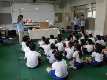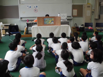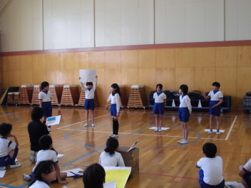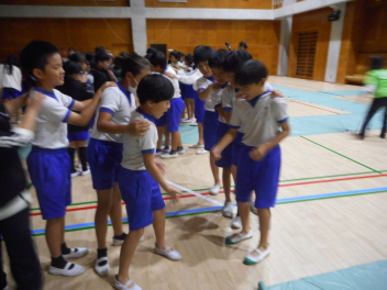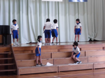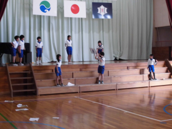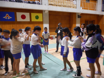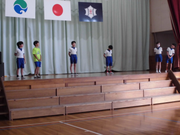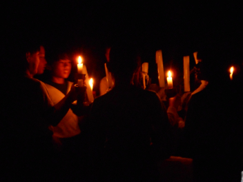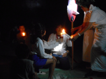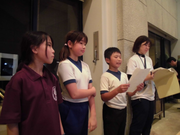 夕食後はキャンプファイヤーの予定でしたが、降雨のため、体育館でキャンドルのつどいとなりました。第1部は火の神から神聖な火を分けていただきました。代表の誓いの言葉とともにメインキャンドルに点火をしました。第2部はレクリエーション。光明小、横山小、みんなで楽しく盛り上がり、5年生のエネルギーのうねりが強く感じられました。第3部は、神聖な火を一人ひとりのキャンドルにともしました。キャンドルの炎が一人ひとりの顔を照らします。みんな自分のキャンドルの炎を見つめながら自分の生活を振り返りました。火の神がお帰りになる歩みに合わせながらキャンドルの炎が一つまた一つと消えていき、キャンドルのつどいも終了となりました。