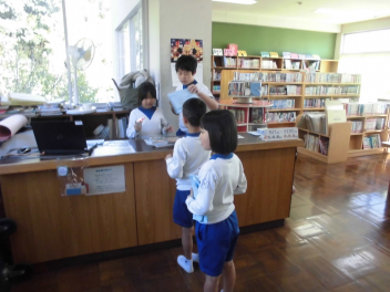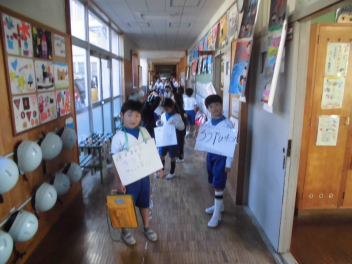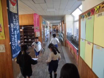 朝は少し冷えましたが、日中は風もなく、暖かな過ごしやすい天候でした。昼休みには子供たちが一斉に運動場に出て楽しそうに遊ぶ姿が見られました。一方で校舎内では、廊下の安全な歩き方を呼びかける子供たちの自治的な活動が展開されていました。今週は1年生が担当。1年生の代表の子たちが、廊下の安全な歩行を呼びかけて校舎内を回ってくれました。また、図書室にも多くの子が来ていました。図書委員にうれしそうに借りる本を差し出す姿が印象的でした。