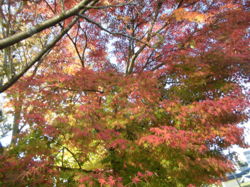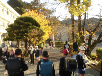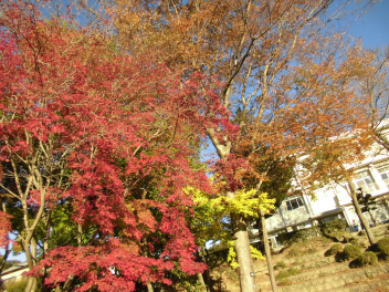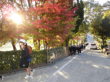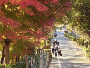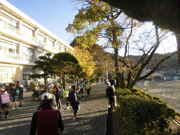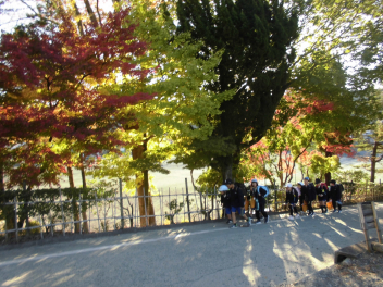 • 子供たちが登校してくる時間帯、ちょうど東からの太陽光が紅葉した樹木を照らします。その木漏れ日の中を子供たちはさざんか通りを登ってきます。モミジ、イチョウ、ケヤキの葉の重なりはまさに芸術。心にも栄養を与えてくれます。