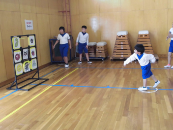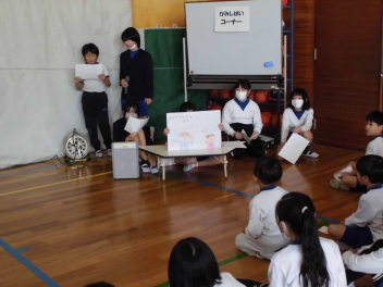 • 先週に引き続き、保体委員会によるイベントが行われました。今日は、1.3.5年生が参加できるイベントでした。体育館の入口にはイベントを楽しみにしていた子供たちが行列をつくっていました。イベントが始まると、ふわふわ言葉やチクチク言葉を説明した紙芝居や健康クイズ、ばい菌をやっつける的あての3つのコーナーを楽しそうにまわり、スタンプが3つ集まるとうれしそうにしている子が多くいました。健康について楽しく学べるイベントでした。保体委員会のみなさん、ありがとう!