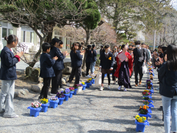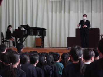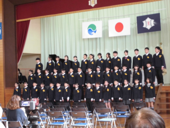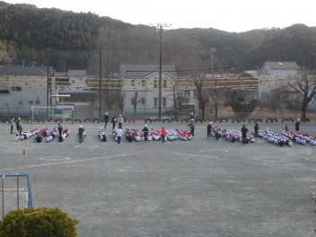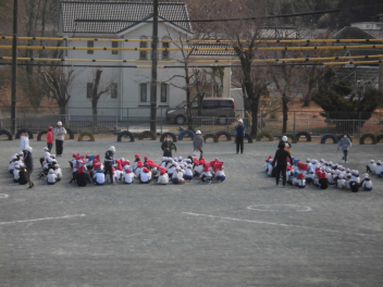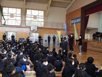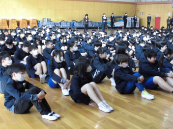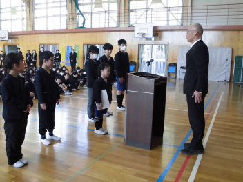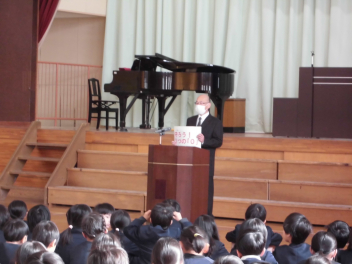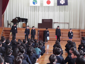 校長は2学期の子供たちの頑張りを称えました。そして、伝統的な季節の行事の話から、おかげさまで無事に生活できることに感謝し、自分や家族の幸せのためにできることを考えようと話しました。また、生徒指導主任から、すてきな冬休みを送るために気を付けることを伝えました。 事故0 非行0 けが、病気0