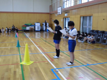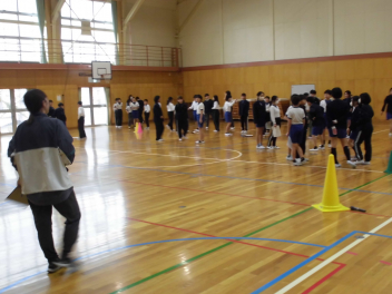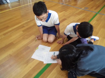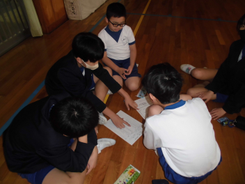 • 4年生の体育では今、フラッグフットボールの学習をしています。アメリカンフットボールが起源となって生まれたスポーツです。アメリカンフットボールで行うタックルの代わりに腰につけたフラッグを取ることでタックルが決まったことになります。セットプレーにおいてランプレーやパスプレーで相手の陣地の奥までボールを運ぶべるかで得点が決まります。そのため、プレー前にチーム内で作戦会議を行います。体力とともに考える力やコミュニケーション力も育てることをねらっています。運動場に子供たちの元気のよい歓声が響いています。