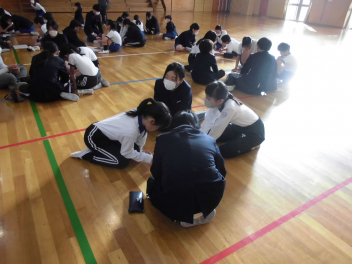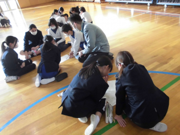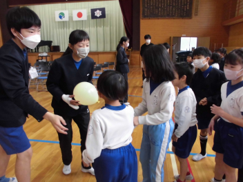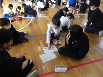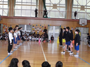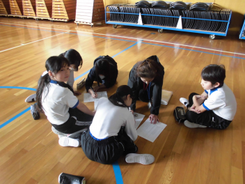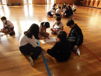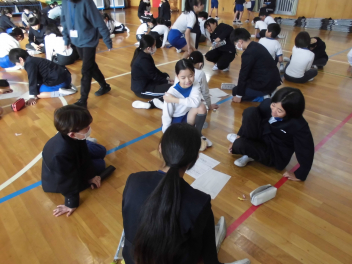 縦割りグループでのゲームと同じグループの仲間からの6年生へのプレゼント