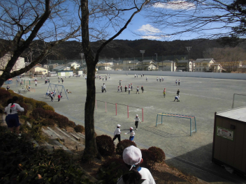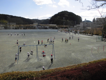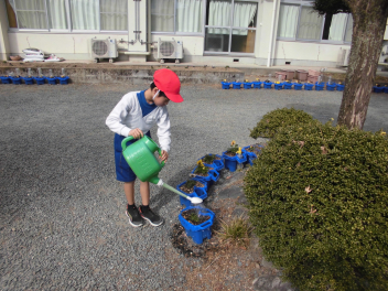 • 昼休みの学校の様子をお伝えします。風は冷たく、時折、強く吹くときもありますが、たくさんの子供たちが元気に運動場で遊んでいます。また、2年生の子たちが先月植えたパンジーにやさしく水をあげていました。