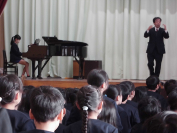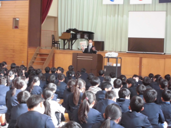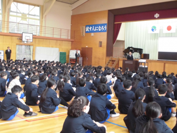 校長は2学期の子供たちの頑張りを称えました。そして、伝統的な季節の行事の話から、おかげさまで無事に生活できることに感謝し、自分や家族の幸せのためにできることを考えようと話しました。また、生徒指導主任から、すてきな冬休みを送るために気を付けることを伝えました。 事故0 非行0 けが、病気0