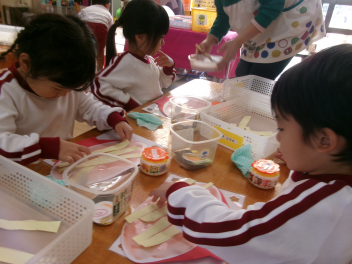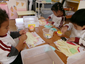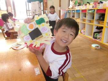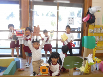 先月末の遠足で、浜松市動物園に行き、たくさんの動物を見てきました。年中ぱんだ組さんは、楽しく動物を見たことを思い出しながら、箱や紙で動物をつくって表現する製作を行いました。