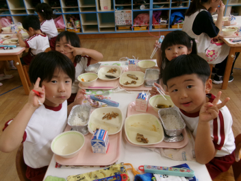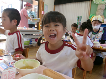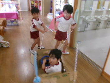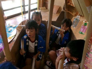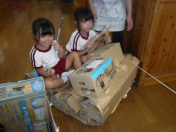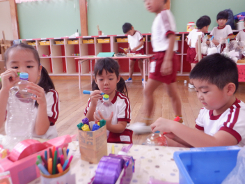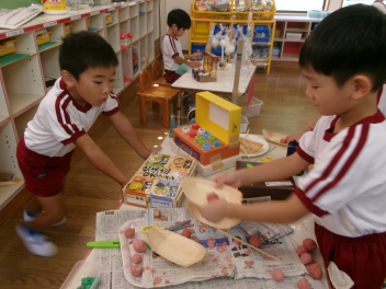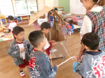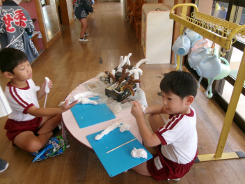 年長らいおん組さんは、歌を歌ったり、にらめっこをしたり、一緒にけん玉を作って遊びました。子供たちと一緒に製作するのは、とても楽しそうでした。