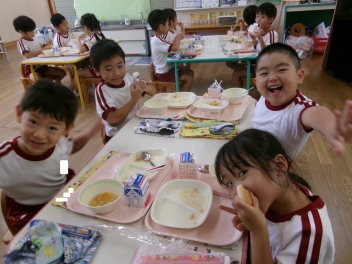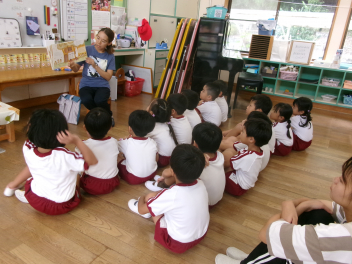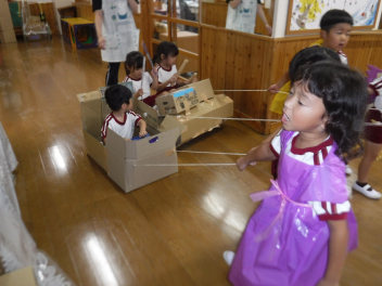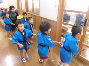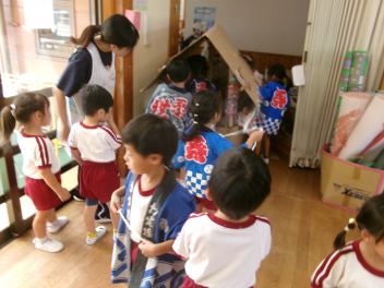 年中ぱんだ組さんも、歌を歌ったり、踊りを踊ったりして触れ合っていただきました。また、風船を打って飛ばすラケットのようなものを一緒に作り、風船を飛ばして楽しみました。