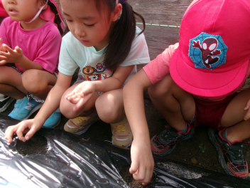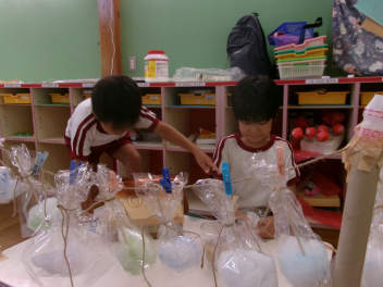 年少ひよこ組さんは、歌や踊りで触れ合ったり、ふわふわボールというビニルの風船を一緒に作って遊んだりしました。おじいちゃん、おばあちゃんへありがとうの気持ちを込めた手作りのプレゼントを渡しました。