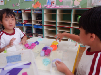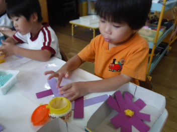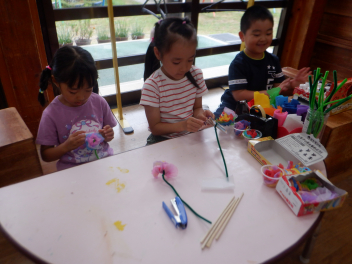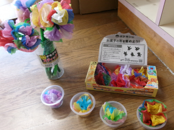 花は、祖父母参観会でおじいちゃん、おばあちゃんにプレゼントした花を思い出しながら作りました。柔らかい色鮮やかな紙を数枚重ねてじゃばら折りにしました。真ん中をホッチキスで止めて、紙を開きながら立てて、花びらのようにしていきました。それを茎にするモールでまとめてたり、カップに入れたり、箱に並べたりしました。