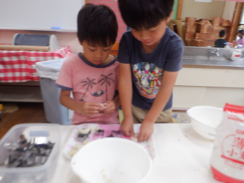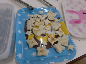 小麦粉に水を加えて練って、粘土状にしました。それを丸や星、ハートなどのクッキーのような形に成形しました。そして、オーブンで焼いて固めました。