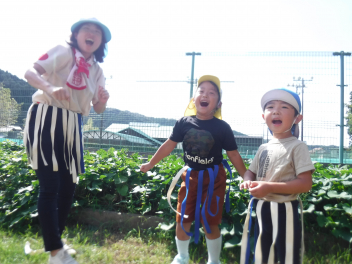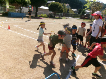 腰のところに、いっぱいしっぽになる帯のひもを付けました。そして、友達のしっぽを取り合いました。園庭を走り回って逃げたり、追いかけたり…汗をかきながら一生懸命走っていました。