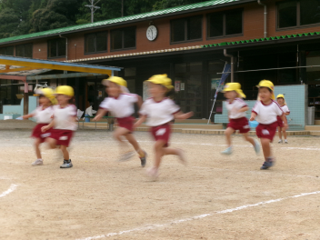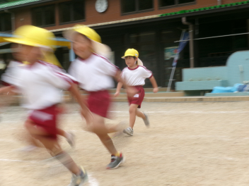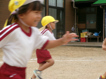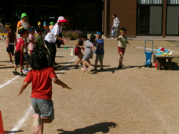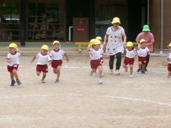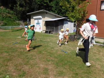 かけっこ遊びは、みんなで並んでスタートし、まっすぐに走りました。先生のいるところまで競走だよ。まっすぐに速く走れるかな。笑顔の中にも真剣な表情で走っていました。