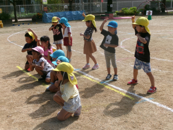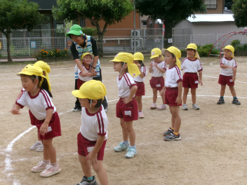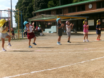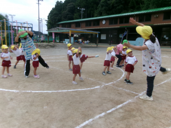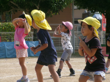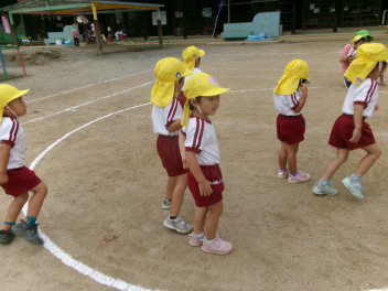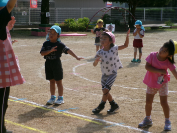 年少ひよこ組さんは、園庭でダンス遊びやかけっこ遊びをしました。