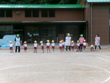ぱんだ組さんは、園庭で「にんじゃカニ」を踊りました。