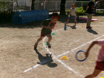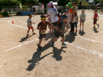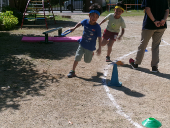 • 今日、年長らいおん組さんは、みんなでリレーをしました。赤、青、黄の3チームに分かれ、新しいヘアバンドを付けて気合を入れました。チームで走る順番を決めて、いよいよスタートです。