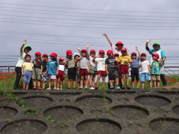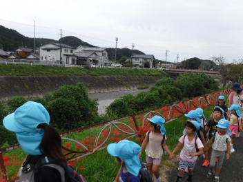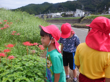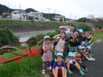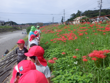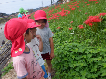 • 年長らいおん組さんと年中ぱんだ組さんは、3日(金)に近くの堤防に咲いている彼岸花を見に行きました。