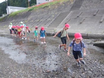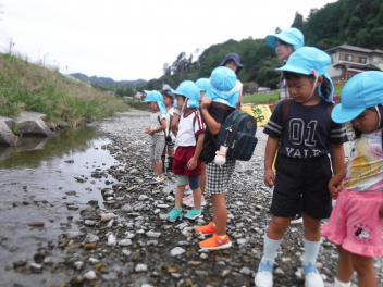 堤防には、鮮やかな赤色の彼岸花が列になって咲き誇っています。みんなは、堤防の上を歩いたり、水の少ない川に降りたりして彼岸花を見ました。観察するように、真近で見たり、においをかいだりしていました。