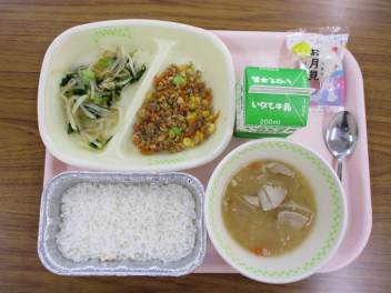 献立「ご飯 そぼろごはんの具 牛乳 おひたし いもこ汁 お月見団子」