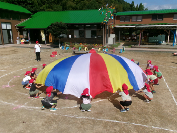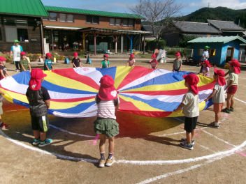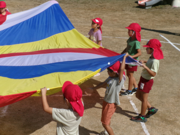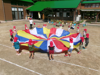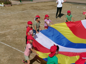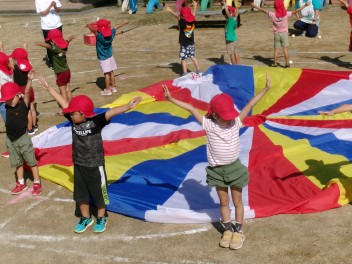 • 7日(火)に、初めて園庭でパラバルーンを行いました。外に出ると、開放感があり、より大きく迫力があるように見えます。