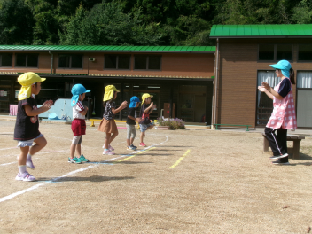 音楽に合わせて、忍者のまねをしながら右に行ったり、左に行ったり、回ったり…2列の場所を入れ替えたり、円形になったり…カニやエビのいろんな動きをしました。その動きは素早く、まるで忍者のようです。