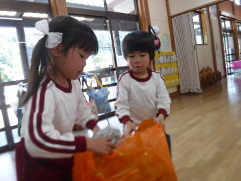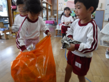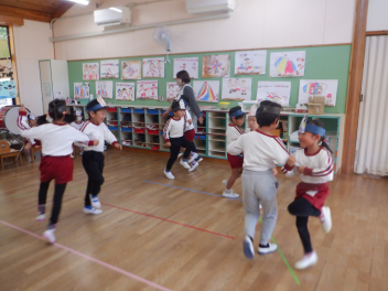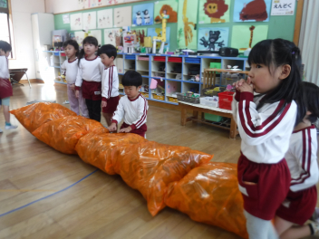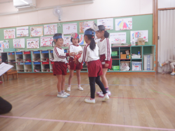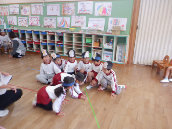 年長らいおん組さんは、劇遊びをしています。役を決めて、どういう動きをしようか、どんな台詞を言おうか、話し合いながら遊びを進めています。子供たちのアイデアがたくさん出てきて、意欲的に劇遊びに取り組んでいます。