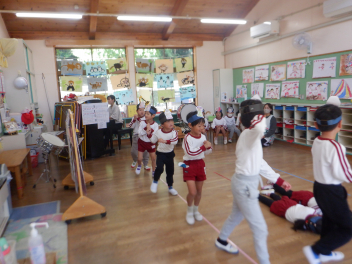 • 年長らいおん組さんは、劇遊びを進めています。今日は、正確に台詞を言ったり、自分で考えて動いたりできるようになり、演技にも熱が入ってきました。友達同士で動きを話し合ったり、声を掛け合ったりして、みんなでつくりあげていこうという気持ちが高まっています。みんなでつくった舞台の背景やセットも、とても素敵ですね。