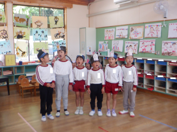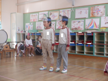 みんなカエルのお面を頭につけて、カエルになりきって動きをつけて台詞を言ったり、歌を歌ったりしました。とっても楽しそうに、笑顔いっぱいで演じていました。