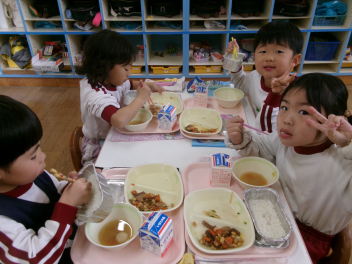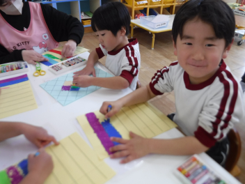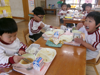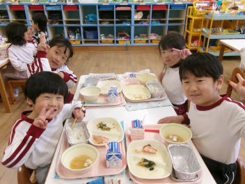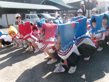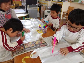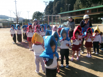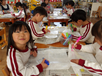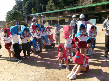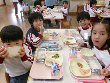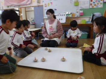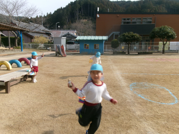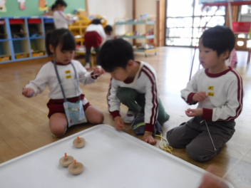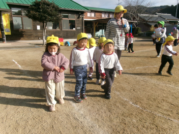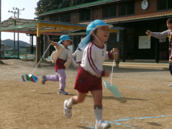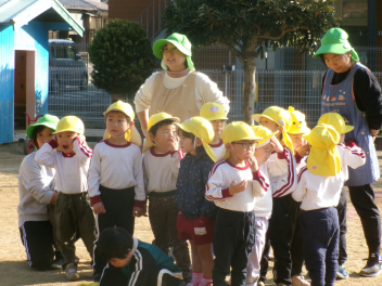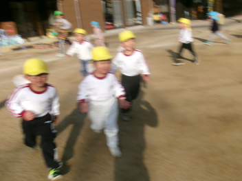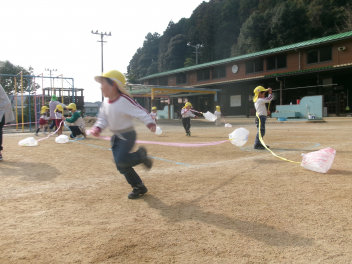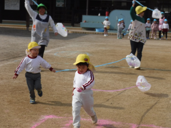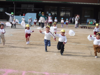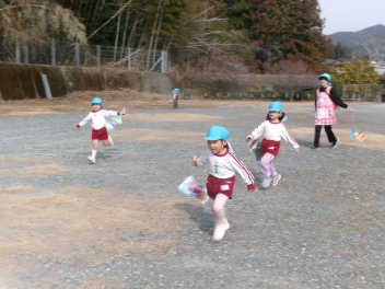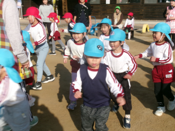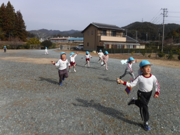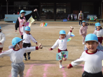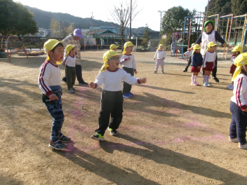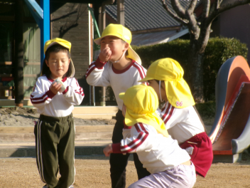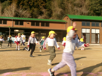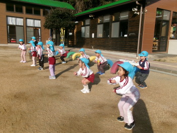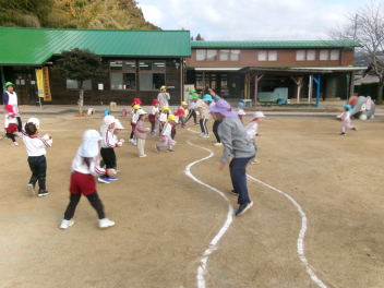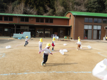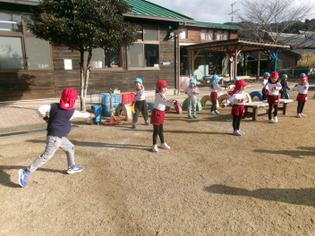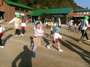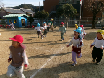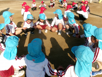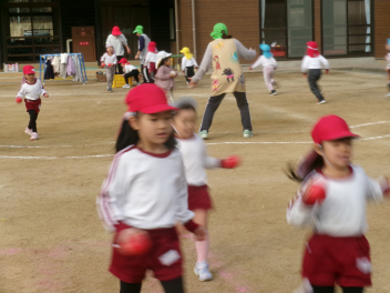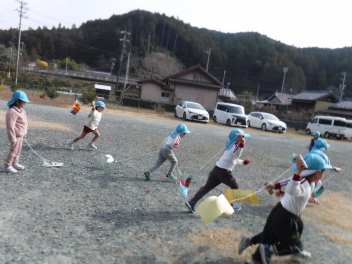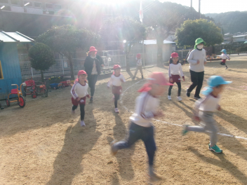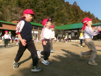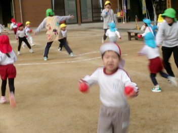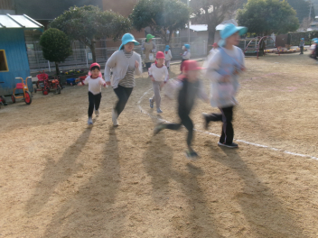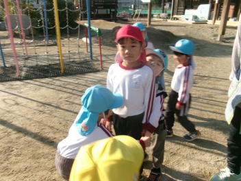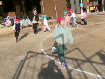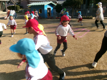 最後は、全員で「こおり鬼」をしました。鬼は先生4人。鬼にタッチされたら、その場で凍ってしまい動けなくなっちゃうよ。仲間がタッチしてくれたら、また動いて逃げられるよ。みんな必死に逃げるけど、先生の鬼は、動きが速くてタッチされちゃったね。でも友達が助けてくれるからね。みんなで楽しく鬼遊びをしました。