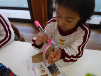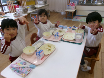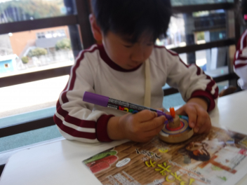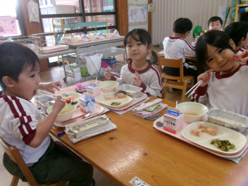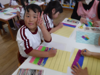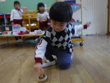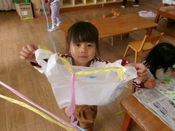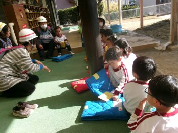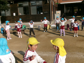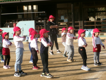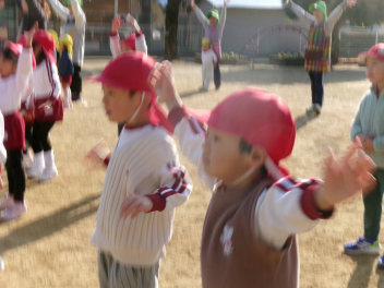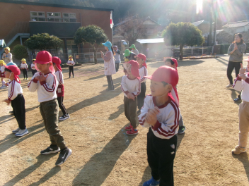 ぱんだ組で踊っている「だるまさんがおどった」という曲を、みんなで踊りました。ぱんだ組さんが先生になって、前に出て踊ってくれました。中国、ブラジル、日本など各国のダンスを取り入れたコミカルな動きで、みんなとっても楽しく踊れました。
