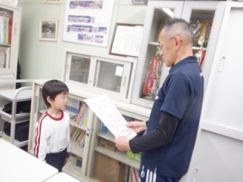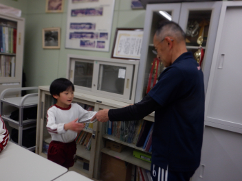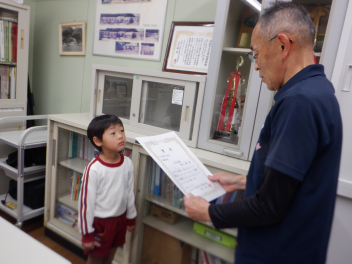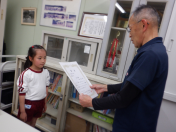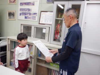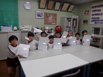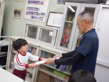 そして、各学年でつくったひな人形を見せ合いました。らいおん組は、紙粘土でつくったひな人形です。ぱんだ組は、トイレットペーパーの芯に顔や服を付けてつくりました。ひよこ組は、色画用紙を切ったり貼ったりしてつくったひな人形を吊るして飾っていました。みんな、表情豊かで個性的なひな人形になりましたね。