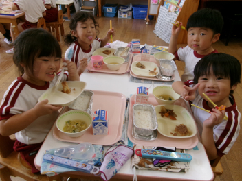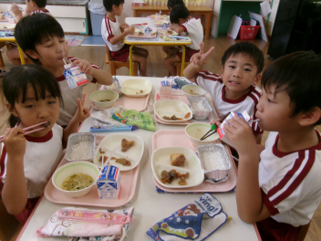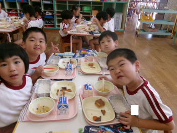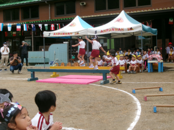そして、「ガンバリマンの歌」を歌い、準備体操として「わらって シャーツ!」を踊りました。子供たちのニコニコの笑顔と元気な歌声、キビキビしたダンスで、見ている人を魅了しました。