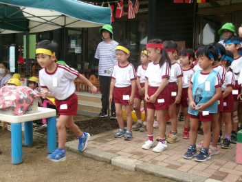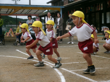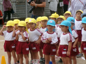 始めの競技は、徒競走「よーいどん!」です。年少ひよこ組は16メートル、年中ぱんだ組は23メートル、年長らいおん組は28メートルを走りました。