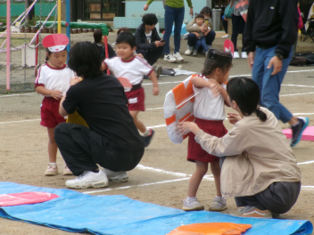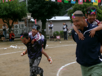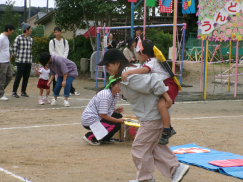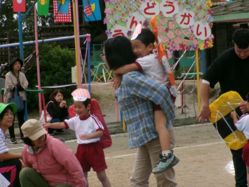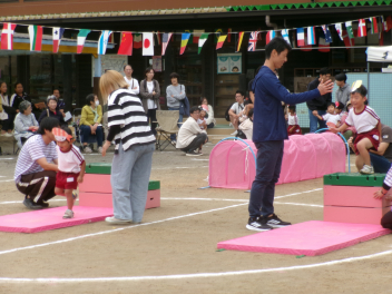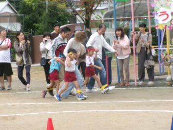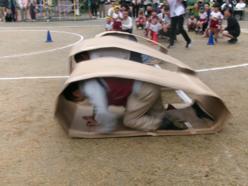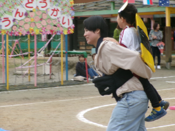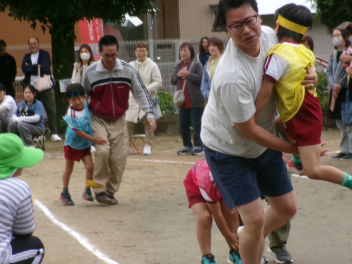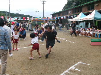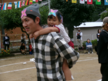 次の種目は、年長さんの親子競技「つなげ!親子・チームの絆!」でした。親子でキャタピラ、二人三脚、だっこかおんぶをして、次のチームにつなぐリレー形式の競技です。