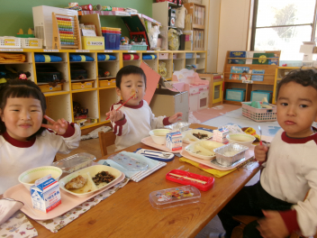 子供たちは、さつまいもなどが入ったみそ汁のおいしさを味わい、楽しく給食をいただいていました。