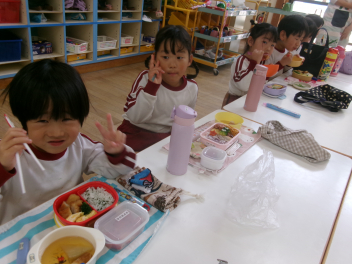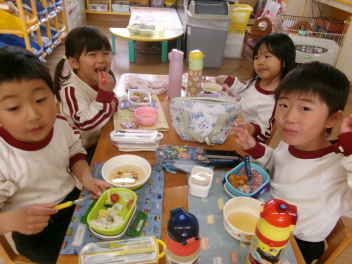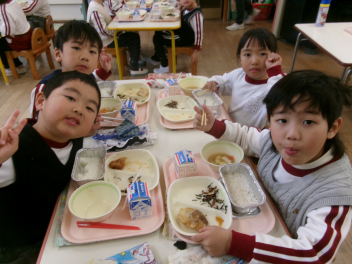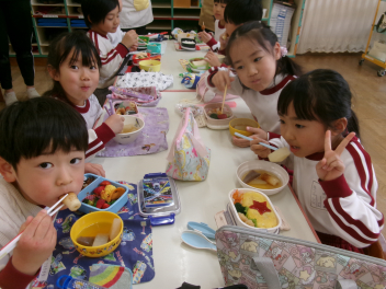 大根にこんにゃく、ちくわが入ったおでんができあがると、早速それぞれの保育室で、お弁当と一緒にいただきました。