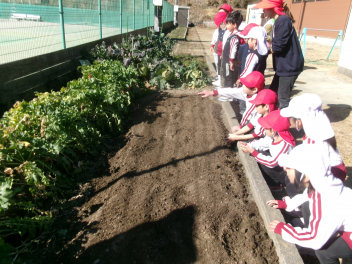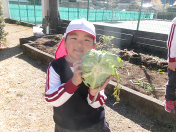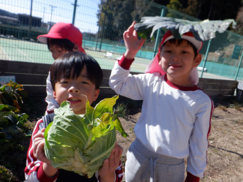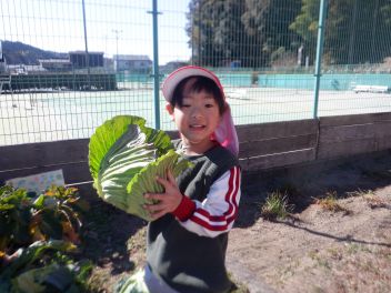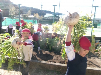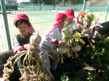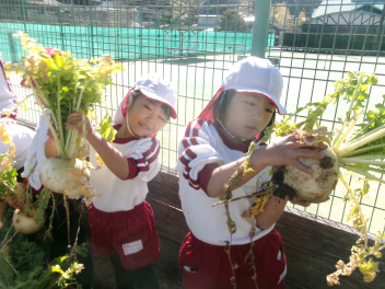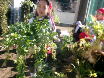 • 年長らいおん組さんは、丸大根の収穫をしました。とっても大きく丸く育った大根があり、みんな驚いていました。