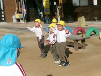 次に、「だるまさんがおどった」と「おでんぐつぐつ」という曲でダンスをしました。お手本になって踊ってくれる子が前に出て、みんなで元気よく体を動かし、楽しく踊っていました。