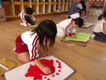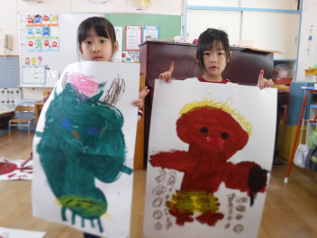 赤や黄緑の絵の具で鬼の顔の形を描き、その上にクレパスで目や鼻、口、角などを描いていきました。