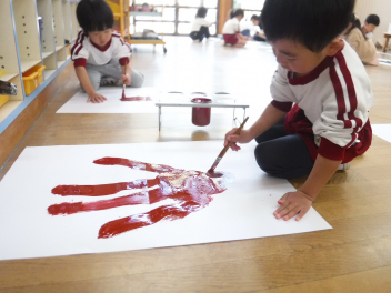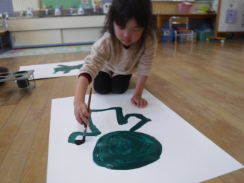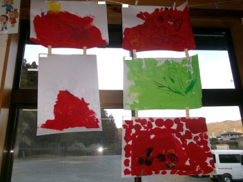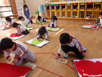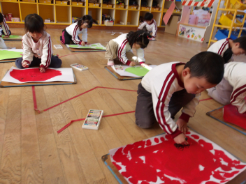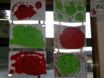 年中ぱんだ組さんは、豆まき会で見た赤鬼と青鬼を思い出しながら、節分の鬼の絵を描きました。
