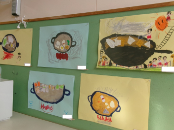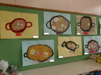 始めに、絵の具でおでん鍋とスープを描きました。具がいっぱい入るように、大きく描きました。そして、入れたい具を別の画用紙にクレパスで描き、切り抜いて、おでん鍋の中に貼りました。おでん鍋がにぎやかになり、とってもおいしそう。