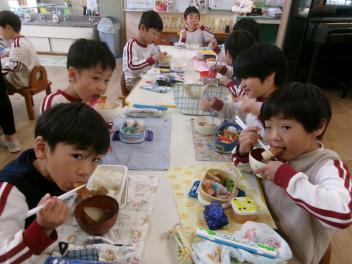 おでんの話で盛り上がりながら、みんなでおいしくいただきました。季節を感じ、食育として有効な活動であり、子供たちもみんなで味わっておいしくいただいていました。